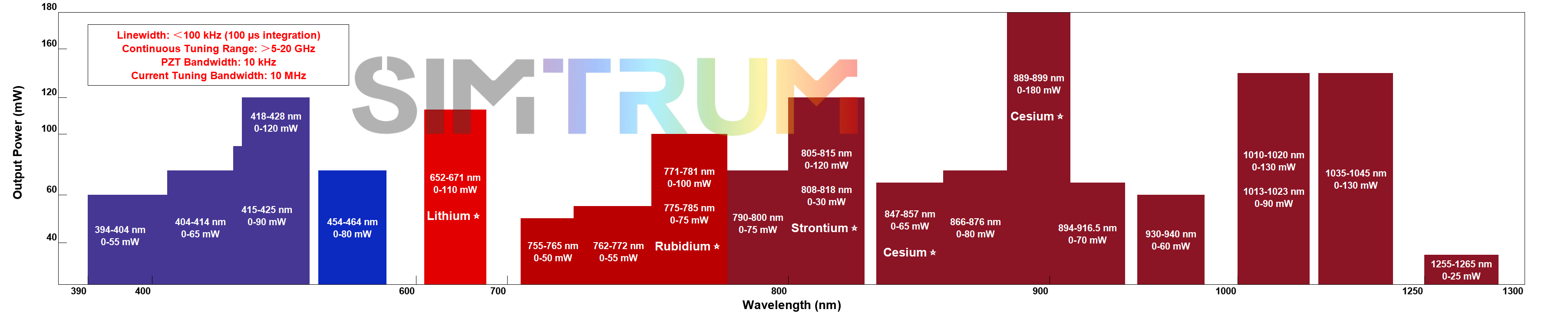 Central Wavelength: 894nm, Free Space Output Power: ≥50 mW (up to 180 mW) ,Linewidth: <100 kHz(100 μs integration), Continuous Tuning Range: >5 GHz ,Output Mode: Free Space (Fiber Output optional) with isolator and controller