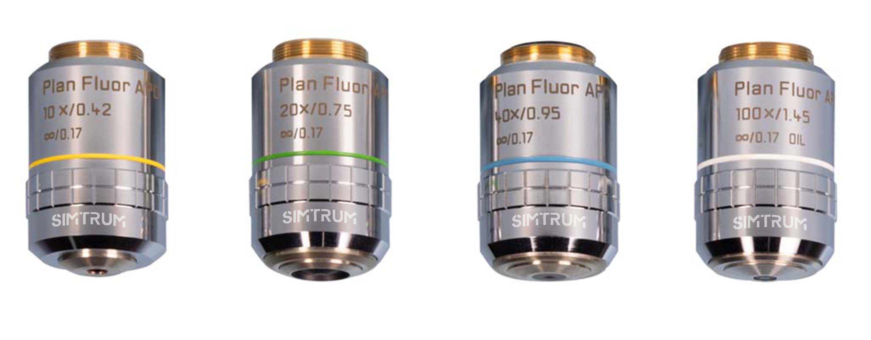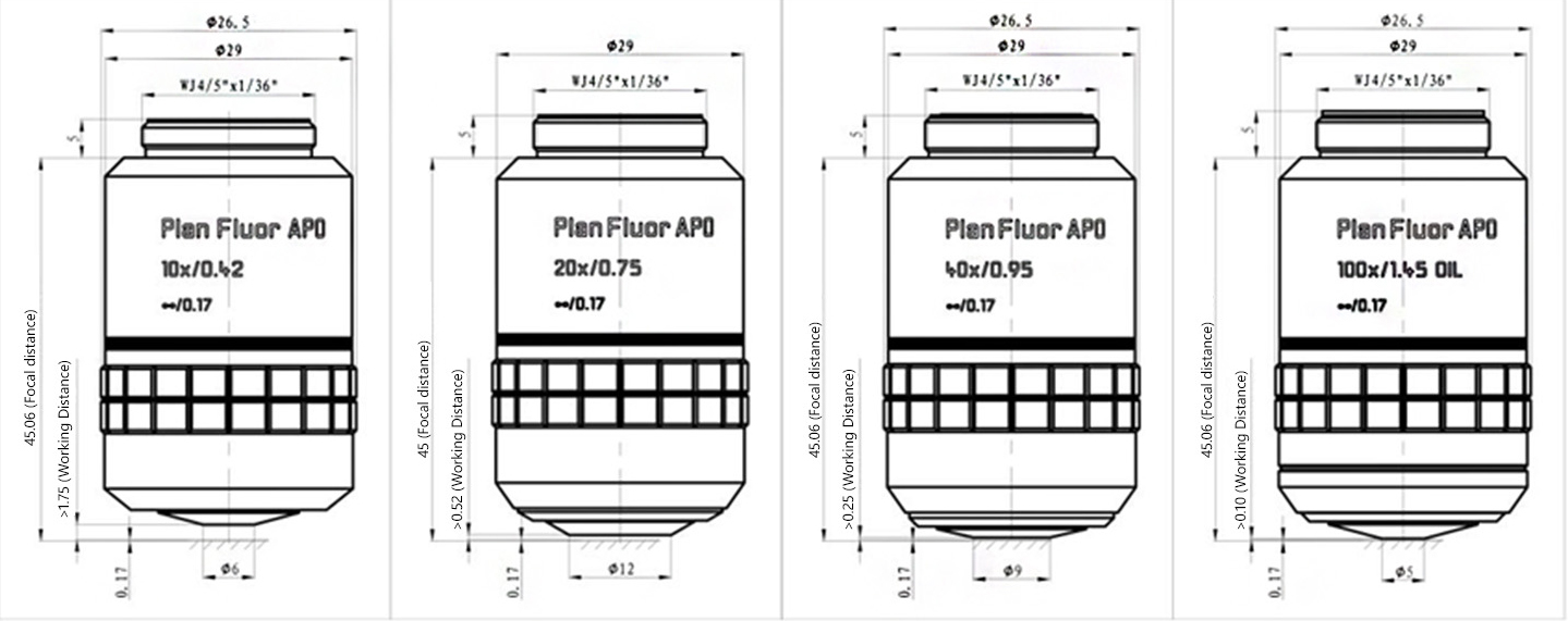 The resolution and depth of focus of the objectives are calculated based on a reference wavelength (λ=550nm)