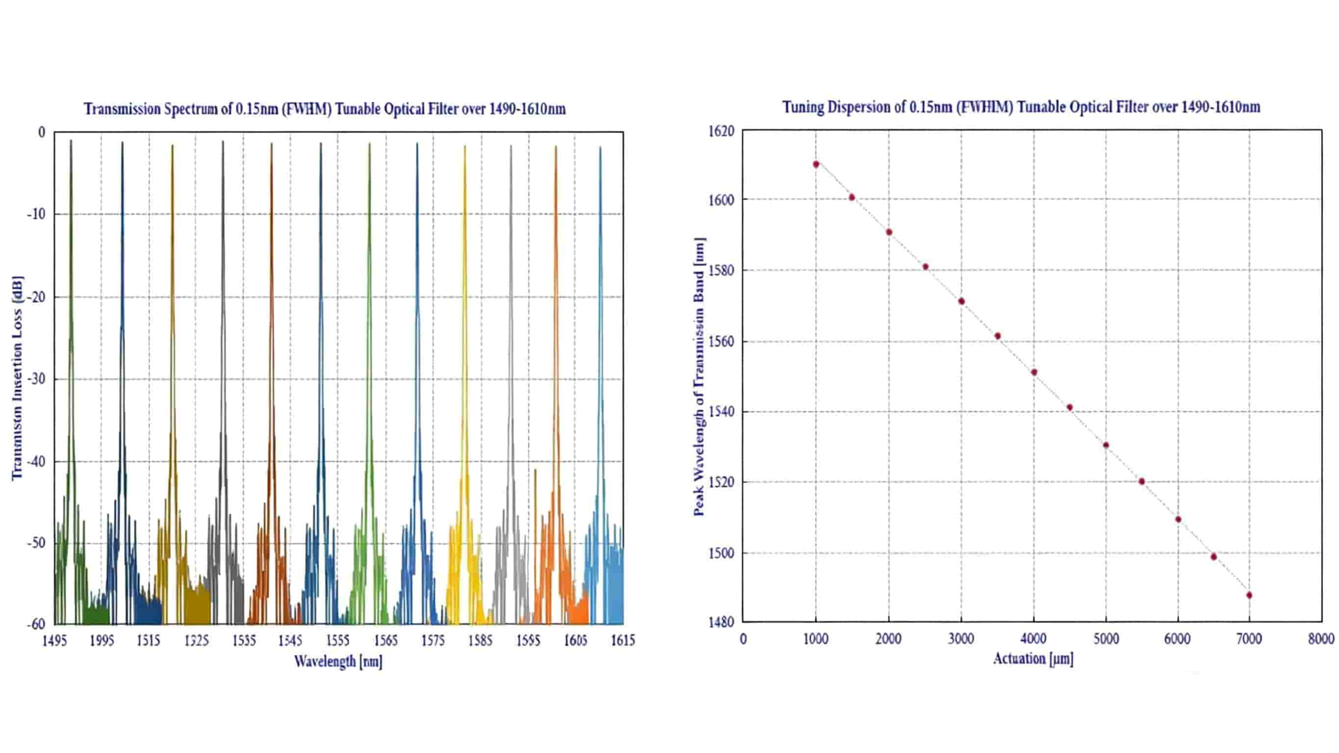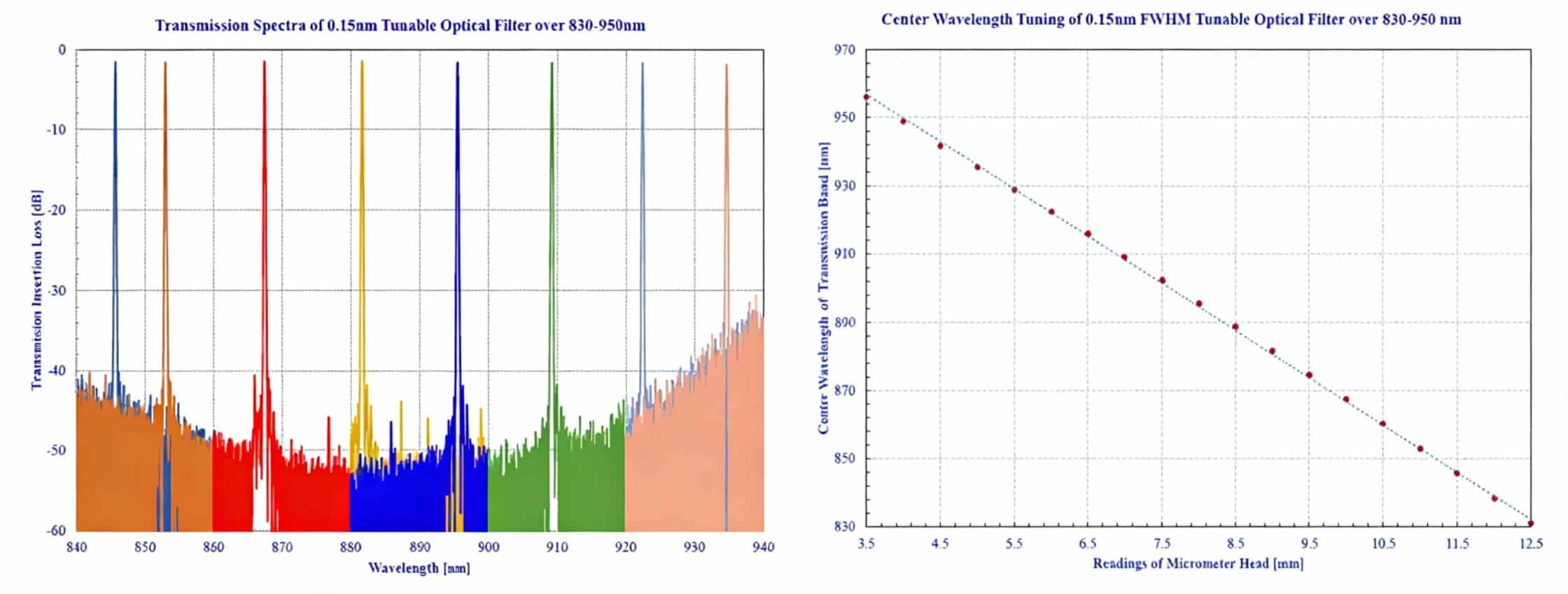 Through optical design, a Gaussian-shaped transmission spectrum is ultimately formed at the output, achieving narrowband filtering. We offer a variety of bandwidth and tuning range options. The operating wavelength range covers the 780-1000nm, X, O, S, C, and L bands, meeting the needs of diverse applications.